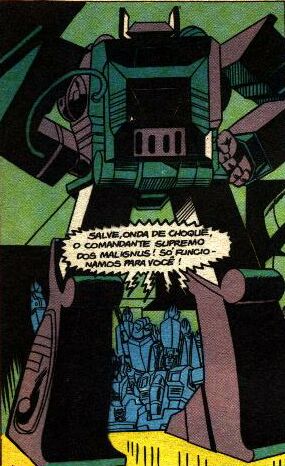 ![]() Shockwave coloca em ação seus planos de conquista, começando por um ataque à usina de G. B. Blackrock. O ataque acaba ferindo a responsável pela segurança e engenharia Josie Beller. Após tomar conta da usina, Shockwave ordena que os demais Decepticons rumem para lá. Megatron ouve as ordens e assiste seus soldados obedecendo-as. Fica furioso, mas nada pode fazer. ![]() Optimus Prime pede ajuda a Buster, mas o garoto não sabe o que fazer. Prime pede que ele desconecte os cabos em sua teste e os conecte nas próprias têmporas, para que eles façam um elo mental. Buster confia em Prime e faz o que ele pede. Há um lampejo de luz e dor, e o humano perde os sentidos. Fora da Arca, Ratchet vê Shockwave retornar e fica preocupado com Buster lá dentro. Shockwave vai conferir a recuperação de Megatron, e quando vira as costas, este se liberta dos cabos. Buster finalmente acorda e deixa a Arca. ![]() ![]() Megatron ataca Shockwave, que com a força do disparo do canhão de fusão, é enviado a quilometros de distância, atravessando as paredes da montanha e desabando em um campo de futebol. Pouco depois, Megatron vem para terminar o que começou, mas é recebido por Shockwave em seu estado totalmente operacional. Os dois lutam, mas Shockwave se aproveita da debilidade de Megatron e provoca-lhe um curto-circuito, quase o matando. Retornando à Arca, ele mostra o corpo de Megatron aos outros e os faz jurar obediência a ele. ![]() COMENTÁRIOS: Devido a um erro grosseiro, Ratchet aparece no último quadrinho com um símbolo Decepticon pintado em sua lataria. ![]() |